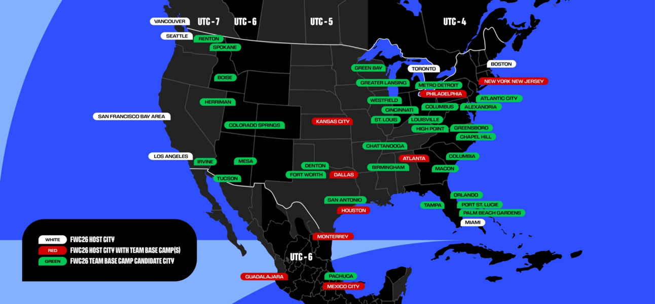 FIFA announced more “Team Base Camps” (i.e. training site + hotel) across North America for the 2026 World Cup.